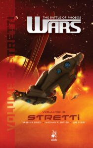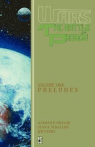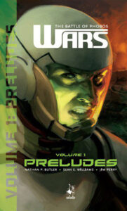 From 2004 – 2005, Decipher, Inc., the company previously known for its Star Wars Customizable Card Game reworked the mechanics of the SWCCG into a new game in its own universe (created by, among others, Michael Stackpole), WARS: The Mumon Rift. Mongoose Publishing also released a roleplaying game and a small number of supplements for the same universe, as the game gained a dedicated following. Five years after the games went on hiatus, Grail Quest Books relaunched the universe with a series of novellas, WARS: The Battle of Phobos, focusing on clash between human factions (Earthers, Gongen AKA Mars, and space pirates known as Mavericks) in the era prior to the original game. Butler was tapped to write the first novella in this prose fiction continuation, Healers and Hunters (Book 1 for the Earther faction), which saw publication as a physical illustrated novella and an ebook (non-illustrated). It was later collected with the first Gongen and Maverick novellas in the paperback Preludes (which eventually had two different covers). He then also wrote the second Earther novella (the fifth overall), On Red Soil, which saw individual ebook publication and collection with the second Gongen and Maverick novellas in the paperback Stretti.